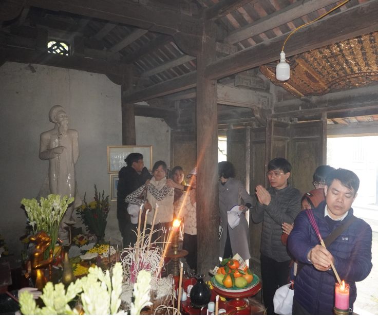 Điểm đến đầu tiên của hành trình là Đền thờ nhà thơ Nguyễn Khuyến thuộc thuộc thôn Vị Hạ, xã Trung Lương, huyện Bình Lục, Hà Nam. Ấn tượng đầu tiên khi đến nơi này là ba chữ “Môn Tử Môn” trên cổng, có nghĩa là cửa ra vào của học trò. Đây là một lời răn dạy nghiêm khắc của nhà thơ về đạo làm trò. Trước khi vào nhà thầy cho dù là quan lớn hay thứ dân đều phải đúng lễ nghĩa, xuống ngựa, xuống xe cúi đầu khi vào nhà thầy. Sau đó là khu Từ đường nằm trong cảnh quan thơ mộng với ao thu, ngõ trúc, vườn Bùi, là nơi thờ tự và lưu giữ các kỷ vật, các bức hoành phi, câu đối của các bậc đại sĩ. Giữa sân là cảnh lớp lớp học sinh đang dâng hương tưởng niệm nhân ngày giỗ của Tam Nguyên.