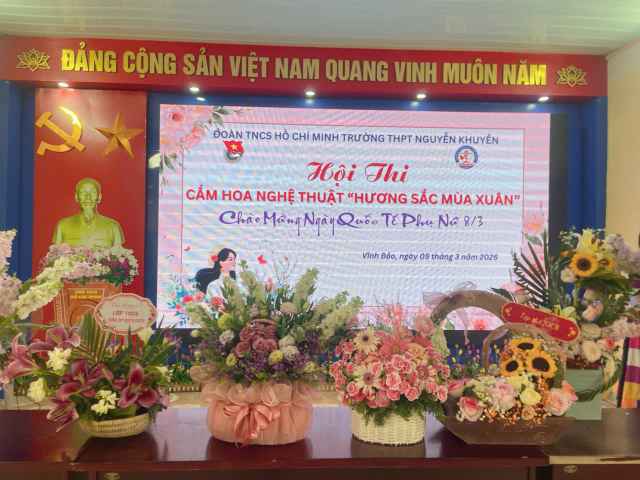 Thực hiện kế hoạch số 10-KH/ĐTN 26 tháng 02 năm 2026 của Ban thường vụ Đoàn trường THPT Nguyễn Khuyến về việc thực hiện Kế hoạch công tác Đoàn và phong trào thanh niên tháng 3 năm học 2025-2026; Kế hoạch số 11/KHLT-THPTNK-ĐTN ngày 27 tháng 02 năm 2026 về việc tổ chức Hội thi cắm hoa nghệ thuật chào mừng ngày Quốc tế phụ nữ 8/3. Được sự nhất trí của Đảng uỷ, Ban giám hiệu nhà trường, chiều ngày 05 tháng 3 năm 2026, Đoàn trường THPT Nguyễn Khuyến tổ chức Hội thi cắm hoa nghệ thuật với chủ đề “Hương sắc mùa xuân” .