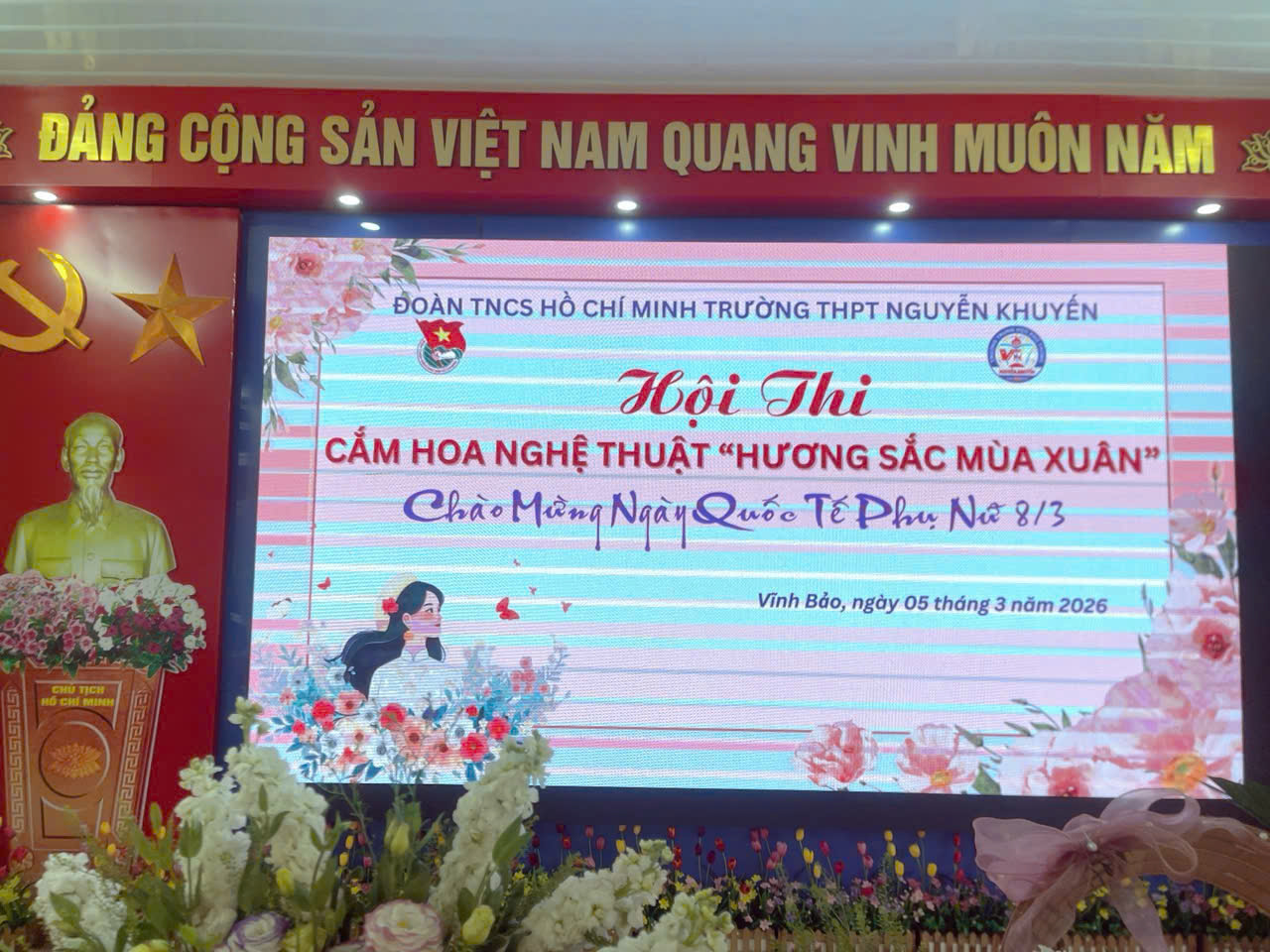 Căn cứ vào kế hoạch hoạt động và phong trào đoàn thanh niên tháng 3 số 10-KH/ĐTN ngày 26/02/2026 và kế hoạch chủ nhiệm tháng 3 của lớp 10C5. Chiều ngày 05/03/2026 lớp 10C5 đã tham gia Hội thi cắm hoa nghệ thuật với chủ đề “Hương sắc mùa xuân” chào mừng ngày quốc tế phụ nữ 08/03 tại sân trường THPT Nguyễn Khuyến.