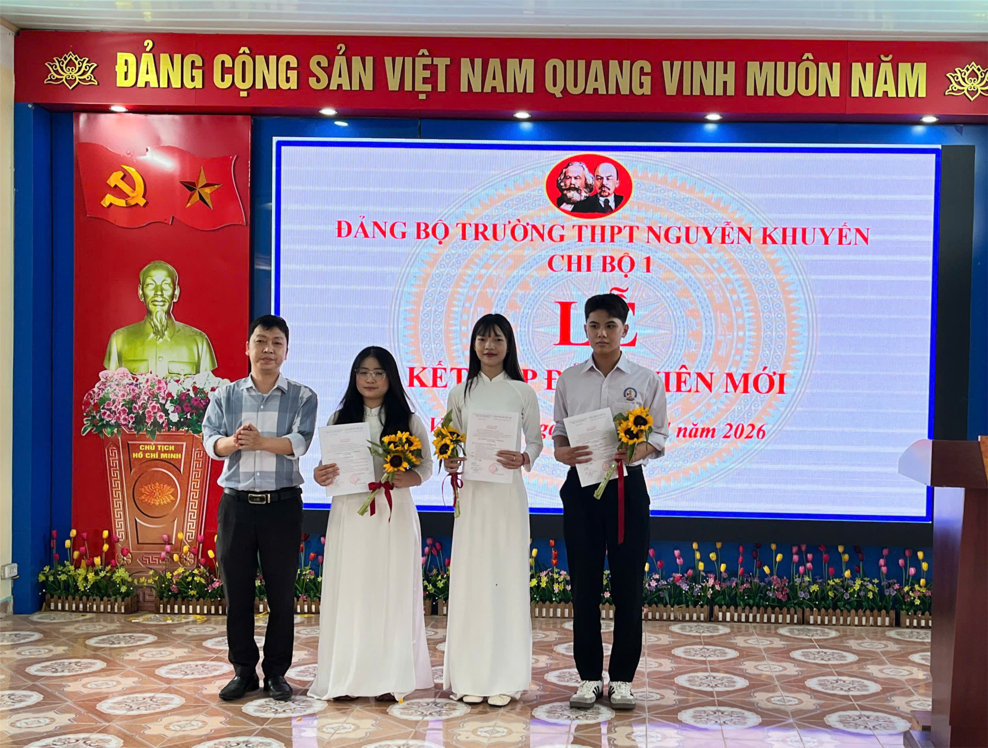 Tại buổi lễ, đồng chí Bí thư Chi bộ đã công bố và trao Quyết định kết nạp Đảng viên của Đảng ủy cấp trên cho học sinh Phạm Thịnh Anh Thư, Nguyễn Thị Bình Yên, Phạm Nguyễn Anh Đức lớp 12A1. Đây là học sinh tiêu biểu, có thành tích nổi bật trong học tập và rèn luyện, tích cực tham gia các hoạt động Đoàn, có ý thức tổ chức kỷ luật tốt, được tập thể tín nhiệm, xứng đáng được đứng trong hàng ngũ của Đảng.
