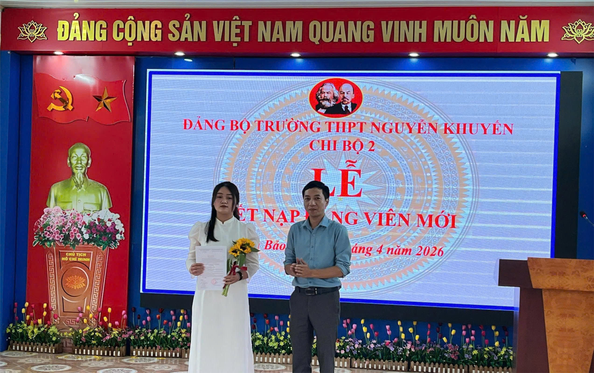 Chiều ngày 23/4/2026, tại hội trường Trường THPT Nguyễn Khuyến, Chi bộ 2 đã long trọng tổ chức Lễ kết nạp Đảng viên mới cho quần chúng ưu tú Nguyễn Thị Vân Oanh – đoàn viên học sinh Chi đoàn 12A6.