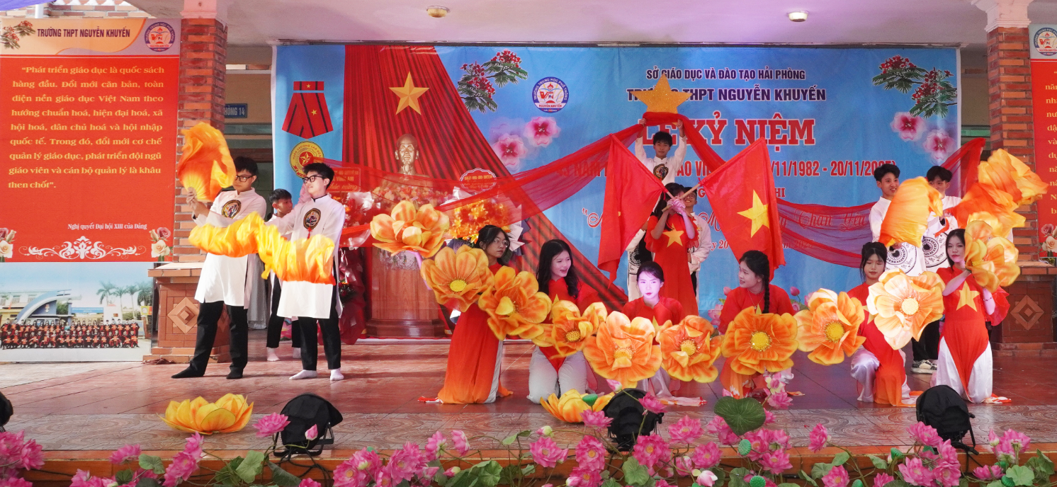 Đồng chí Bùi Thị Lý - Phó Bí thư Thường trực Đảng ủy xã Vĩnh Bảo tặng hoa chúc mừng Trường THPT Nguyễn Khuyến Đây là dịp để cán bộ, giáo viên nhà trường cùng ôn lại những chặng đường đã qua, tự hào về những thành tích, kết quả đạt được, tiếp tục viết tiếp hành trình 26 năm xây dựng và trưởng thành cùng nhau hướng tới một tương lai tươi sáng hơn cho sự phát triển giáo dục của nhà trường.