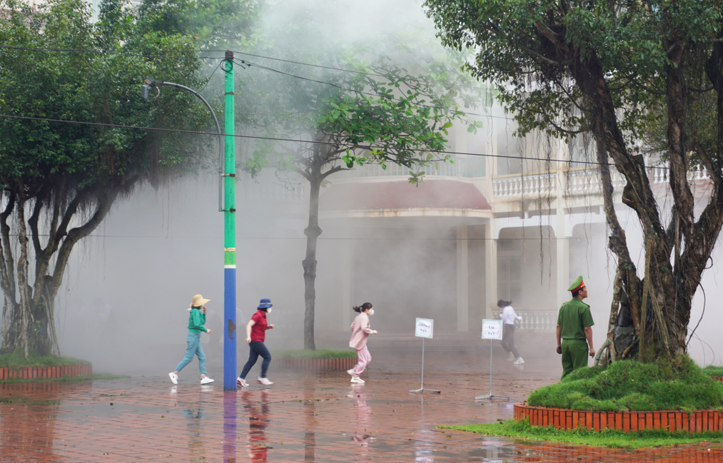Về trang thiết bị phục vụ diễn tập bao gồm toàn bộ các trang thiết bị thiết yếu như xe cứu hỏa, bình chữa cháy, cáng cứu thương, cầu thang thoát hiểm và các mô hình giả định khác….