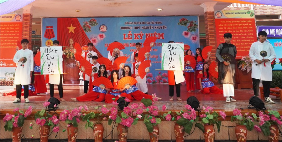 Tiến tới lễ kỷ niệm 43 năm ngày Nhà giáo Việt Nam của trường THPT Nguyễn Khuyến, Đảng ủy đã ra nghị quyết lãnh đạo, chỉ đạo nhà trường, tổ chức Đoàn thanh niên cộng sản Hồ Chí Minh nhà trường xây dựng kế hoạch hoạt động phù hợp với thực tế. Vừa học tập vừa vui chơi tham gia các hoạt động tập thể. Bằng những hoạt động cụ thể và thiết thực thầy và trò nhà trường đã ra sức thi đua dạy tốt, học tốt để đạt nhiều thành tích chào mừng ngày lễ trọng đại của Ngành giáo dục Việt Nam. Các hoạt động diễn ra sôi nổi nhiệt tình. Thầy thi giảng, trò thi đua học. Kết quả 100% thầy cô giáo có tiết giảng xếp loại Giỏi, 100% các giờ đăng ký học tốt của học sinh các lớp được đánh giá xếp loại Tốt, hàng trăm điểm 10 là những bông hoa tươi thắm, là những món quà vô giá mà các em học sinh đã dâng tặng các thầy cô. Đoàn thanh niên cộng sản Hồ Chí Minh nhà trường phát động cuộc thi “Múa hát về mái trường thân yêu” . Đây là hoạt động ngoài giờ lên lớp thu hút đông đảo học sinh các lớp hưởng ứng, tham gia. Trong những ngày trước khi diễn ra các vòng thi văn nghệ, không khí trong sân trường luôn nhộn nhịp với hình ảnh các đội văn nghệ tranh thủ thời gian tập luyện với mong muốn tiết mục của lớp mình sẽ đạt thành tích cao. Trong tổng số 30 tiết mục văn nghệ của 30 lớp trong toàn trường, Ban giám khảo đã chọn ra 10 tiết mục đặc sắc nhất để tham gia vòng chung khảo được tổ chức đúng vào lễ kỷ niệm 43 năm ngày Nhà giáo Việt Nam 20/11. Những tiết mục văn nghệ đến từ những nghệ sĩ không chuyên nhưng bằng tài năng, nhiệt huyết của tuổi trẻ và một lòng biết ơn, kính trọng thầy cô, các em học sinh đã ký gửi được mong muốn của hàng nghìn học sinh nhà trường, muốn dùng lời ca, tiếng hát, dùng những điệu múa mộc mạc của mình gửi đến các thầy các cô lời tri ân sâu sắc và sự tôn kính lớn lao.